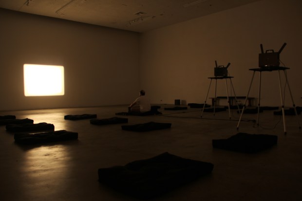 Offset 16mm projectors create an un-moving image: a field of light with a bright, inset rectangle. Sine tone, harmonium, and voice harmonize with and amplify the sound of the projectors.