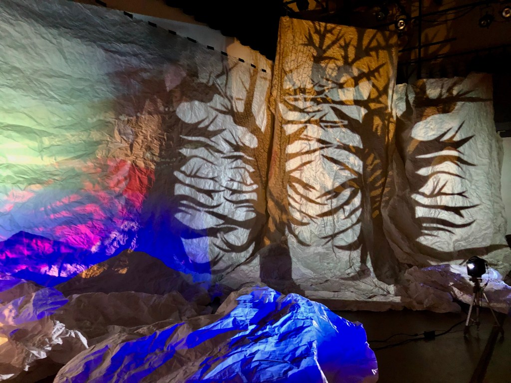 The Endless End was created at the DEAR residency for time-based arts in 2020 (Oakland, CA) during the COVID-19 pandemic, while the skies were apocalyptically tinged orange with wildfire smoke. The piece was then installed as a looping 750 sq ft multi-channel cinematic sculptural installation at the San Jose Institute of Contemporary Art for five months in 2022. Facing West Shadows worked together to create the installation (principal members: Lydia Greer (artistic director) and Caryl Kientz (theatrical director) in collaboration with artist Ya Wen Chien with additional artwork provided by John Hundley Greer and children who created and sent bird and insect puppets to Facing West Shadows during the pandemic. Music composed by Kristina Dutton and Fay LaRoque.