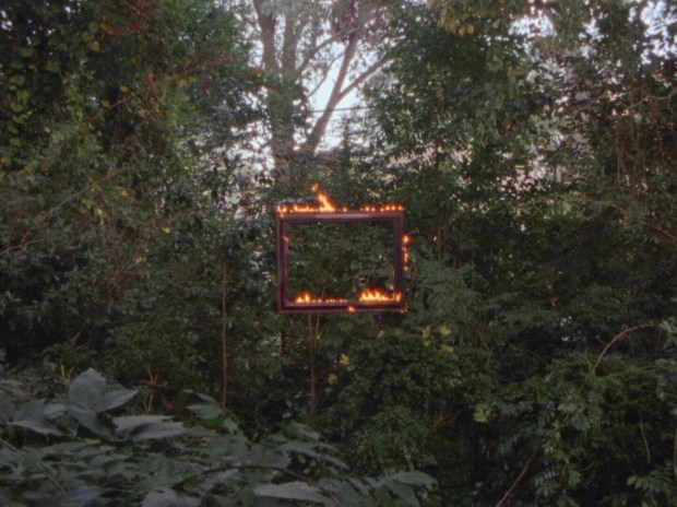 A sense memory of the archive presents itself. The sun magically settles between the crevice of two trees; the warp and weft of the forest turns into a macro lens that obsessively documents the ridges that appear on a butterfly wing; a magnifying glass searches in the negative space of loss and absence; fire flickers through glass, water, and finally consumes the frame within the frame.