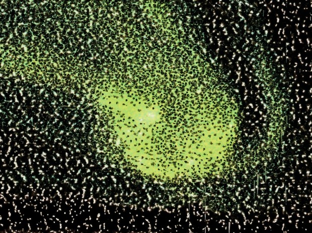Light in its many forms—solar, aurora borealis, from a projector, peaking through 16mm brackets—is the subject and material of Solar Storm. The film toggles between the scales of the granular and microscopic to the vast and planetary. United in this collage of found and re-animated footage, one finds: an analog countdown from the start of a film reel, sun spots, magnetic field disturbances, and an overheard conversation. The film is created using an ink-jet direct-on-film technique where the digital frame is printed directly onto recycled 16mm celluloid.