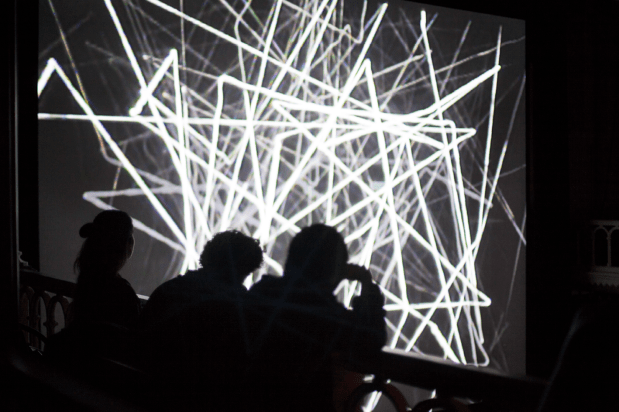 On opening night, Cosmic Rays offered a selection of three live projection performances, staged at a concert venue named Cat’s Cradle. Ephemeral, abstract, and often very, very loud, these sets afforded a look under the hood of a wide spectrum of analog and digital technologies, which the performers hacked and manipulated in real time. Tomonari Nishikawa’s Six Seventy-Two Variations (an earlier iteration of which the artist performed in the Currents section of the New York Film Festival in 2021) was the most minimalist of the three, consisting of a projection of a loop of clear 16mm leader, to which Nishikawa added a steady accumulation of scratches. As the performance unfolded and the artist’s jagged engravings filled the frame, the projector’s optical sound sensors registered them as awkward ka-chunks which gradually coalesced into a pulsating off-rhythm. At the other technological extreme was Jon Satrom’s dizzying and frequently hilarious screen-share performance, Prepared Desktop, in which the artist ran simple scripts to exploit the basics of the Mac OS interface—including many of its familiar functions, alert sounds, and text-to-speech voices—in subtle, then wildly maximalist ways. Somewhere in the fuzzy middle of the analog-digital divide, Jonas Bers’s ΔV/ΔT—named for the acceleration formula—made use of an oscilloscope, two video mixers, and a mad scientist’s bank of knobs and wires. Bers sculpted waveforms into undulating monochrome blobs to produce an electronic cacophony, conjuring a sense of (controlled) danger as he explored the thrilling polarities of signal and noise.